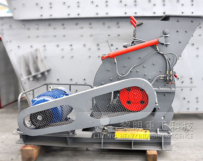 主機(jī)通過電機(jī)、三角皮帶帶動(dòng)主軸,從而使轉(zhuǎn)子旋轉(zhuǎn),錘頭受到旋轉(zhuǎn)時(shí)所產(chǎn)生的離心力向四周伸開,大塊物料從進(jìn)料口進(jìn)入破碎腔之后,便被高速運(yùn)動(dòng)的錘子擊碎。破碎合格的物料則由下部有縫隙的蓖條排出,不合格的則留在破碎腔內(nèi),被錘子和承擊鐵塊反復(fù)作用,直至能夠合格排出。為避免堵塞,被粉碎物料的含水量一般不超過5%