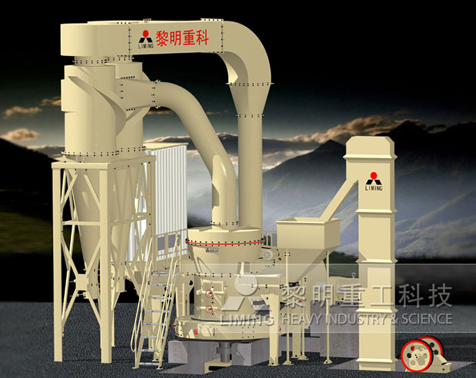 工作時,大塊狀物料經(jīng)顎式破碎機(jī)破碎到所需粒度后,由斗式提升機(jī)將物料送至儲料斗,再經(jīng)振動給料機(jī)將物料均勻定量連續(xù)地送入主機(jī)磨室內(nèi)進(jìn)行研磨,粉磨后的粉子隨風(fēng)機(jī)氣流上升,經(jīng)分析機(jī)分級,符合細(xì)度的粉子隨氣流經(jīng)管道進(jìn)入旁路集粉器內(nèi),進(jìn)行分離收集,最后由粉閥排出成品粉子。整個氣流系統(tǒng)是負(fù)壓密閉循環(huán)的,氣流由旁路集粉器上端回風(fēng)管吸入離心引風(fēng)機(jī),因而保證了生產(chǎn)現(xiàn)場的環(huán)保衛(wèi)生。